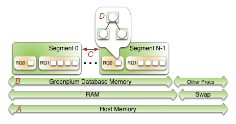 Segment(C)每个都会得到等份的Greenplum数据库内存(B)。